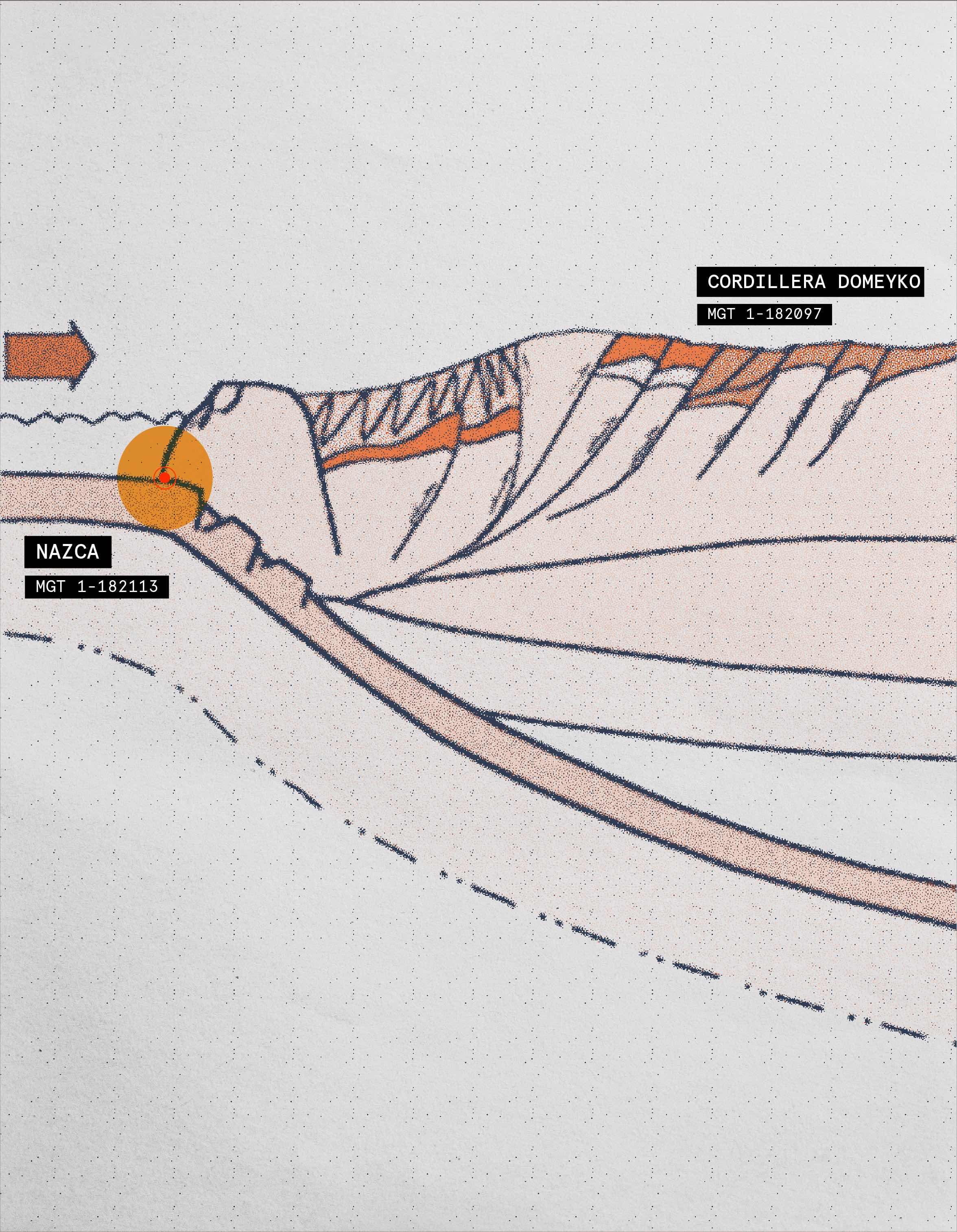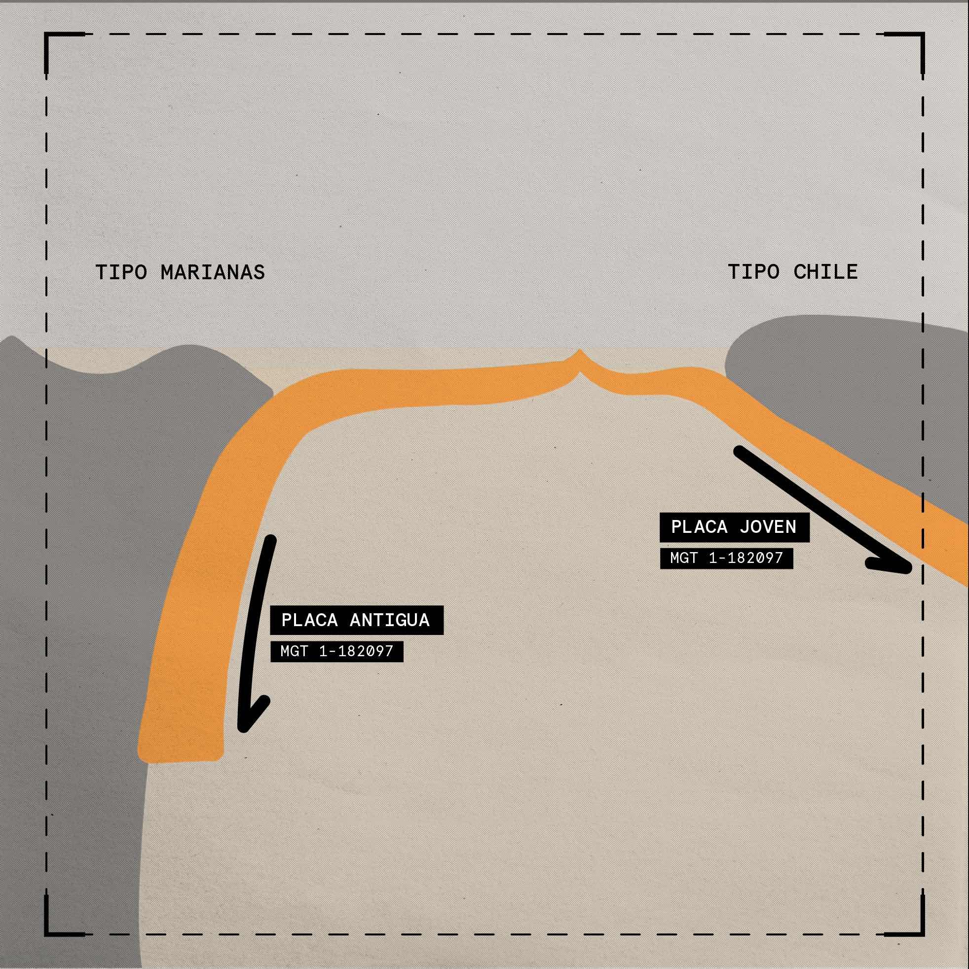 Cuando dos capas de distinta composición se enfrentan, una se hunde por debajo de la otra causando una subducción. Si ambas capas están formadas por cortezas oceánicas, al sumergirse el ángulo de inclinación suele ser de 70º y se le conoce como una subducción de tipo Marianas, pero si una de ellas es corteza continental y la otra oceánica, esta última se hunde en un ángulo bajo entre 20º y 30º, llamándose subducción tipo Chilena.